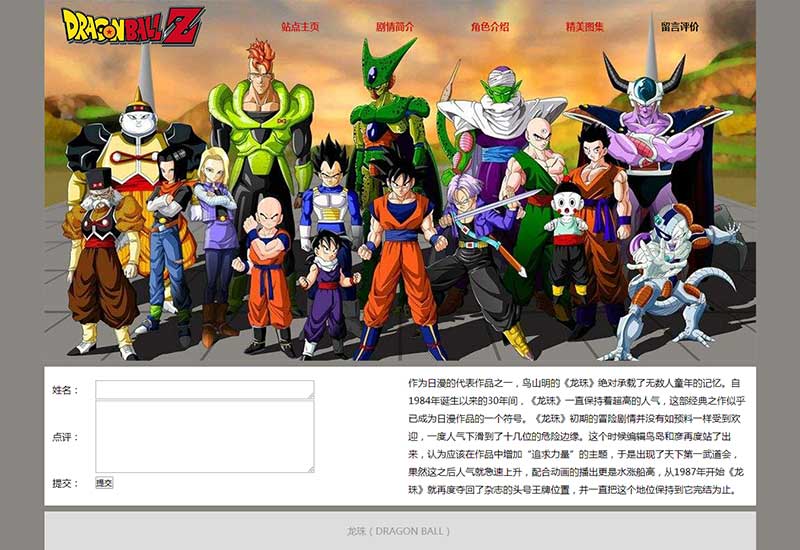 当前位置:静态网页 动漫 首页子页面子页面子页面子页面文件目录 作品介绍 网页作品采用表格布局制作,共5个页面,知识点应用了LOGO、导航、顶部大图背景、页面背景颜色、中间部分插入表格(基本信息介绍表格)、下面图片列表、底部版权信息等。子页面有简单的文字内容页,和丰富的角色图文页面。表单留言页面,按钮加入了JavaScript弹窗反馈,首页插入了背景音乐。 动画片 本站提供的网页作品主要为个人学习参考使用。若网页框架中的素材或文字侵犯了您的权益,请联系在线客服投诉删除。
